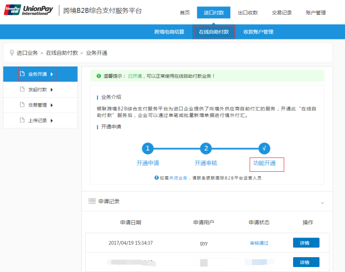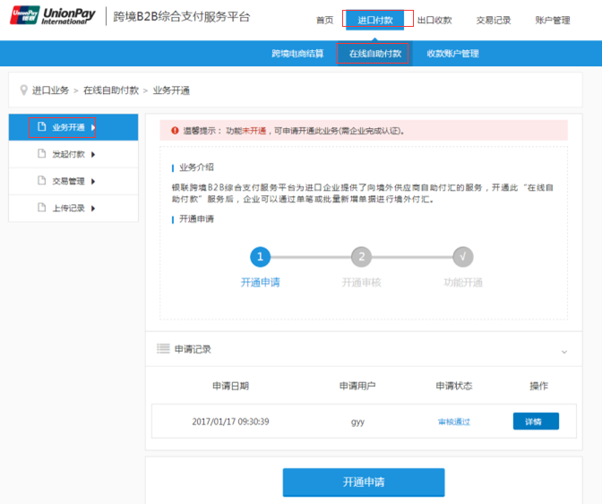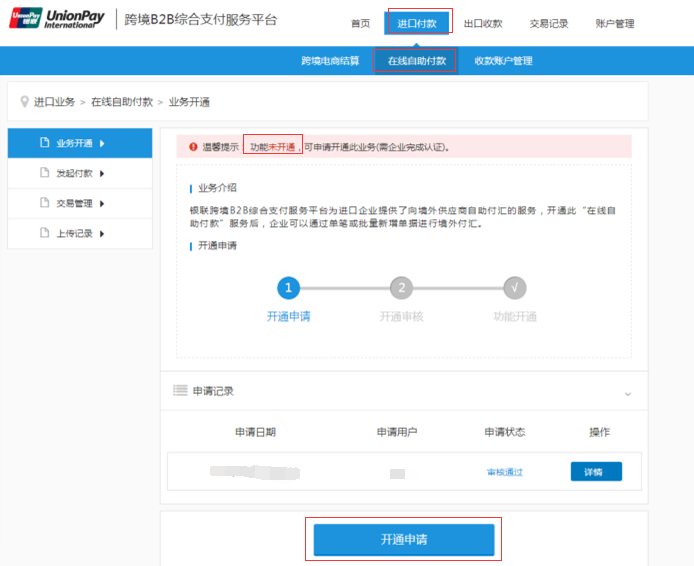 登陆企业账户,进入进口付款-在线自助付款-业务开通栏目页面。