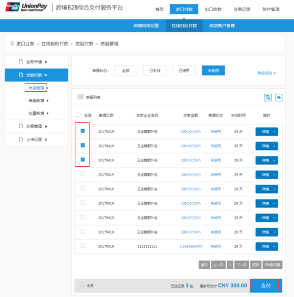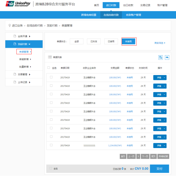 选择单笔或多笔单据状态为未使用且交易币种相同的单据,点击支付。