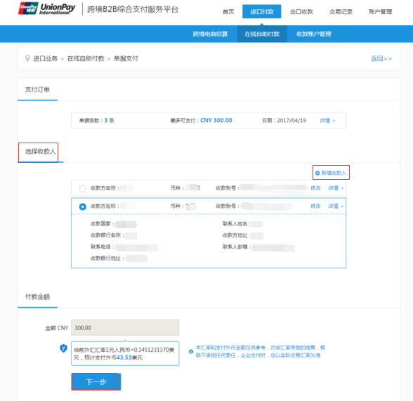 进入到单据支付页面,确认支付订单信息,选择收款人,点击下一步。