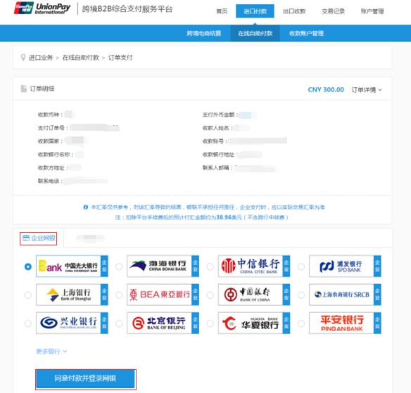 进入到订单支付页面,选择相应企业网银完成支付。
